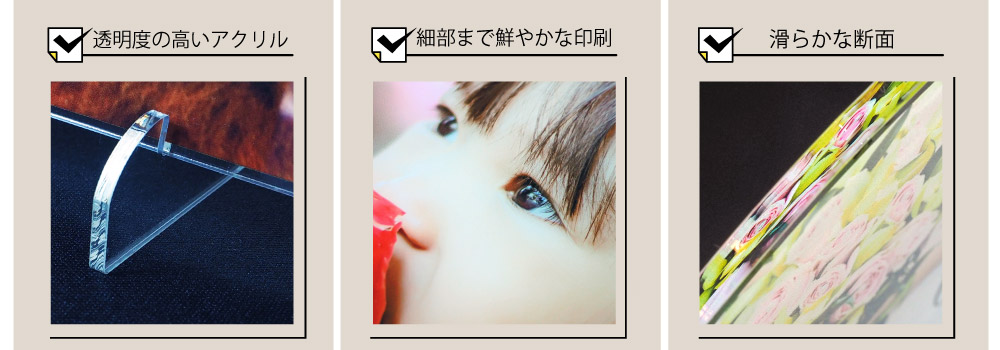 美しい透明度の高いアクリルを使用。印刷は写真やイラストを細部まで鮮やかキレイに印刷するUVダイレクトプリントを使用し、裏面は印刷がはっきりみえるように白おさえ処理をしています。アクリルはつるんとした氷の様に滑らかな切断面(アイスメルトカット)が特徴のDRAGONを使用してカットしています。