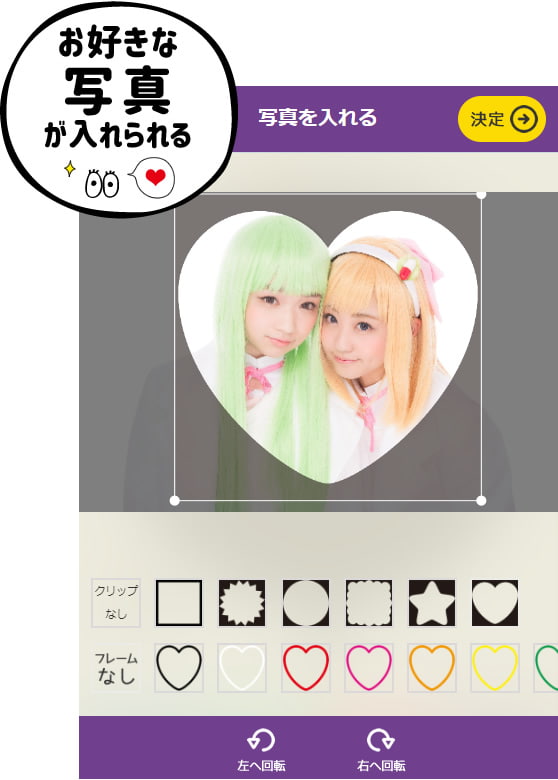 - 画像(写真)やスタンプ、文字を配置した際、動作が軽くなるよう画質を下げて表示しており、Web画面上では画像やフチ(境目)部分が少々粗く見えますが、画像そのものの画質で作成いたします。実際にプリントされたものは、もともと画質の悪いものでなければ、なめらかに仕上がりますのでご安心ください。